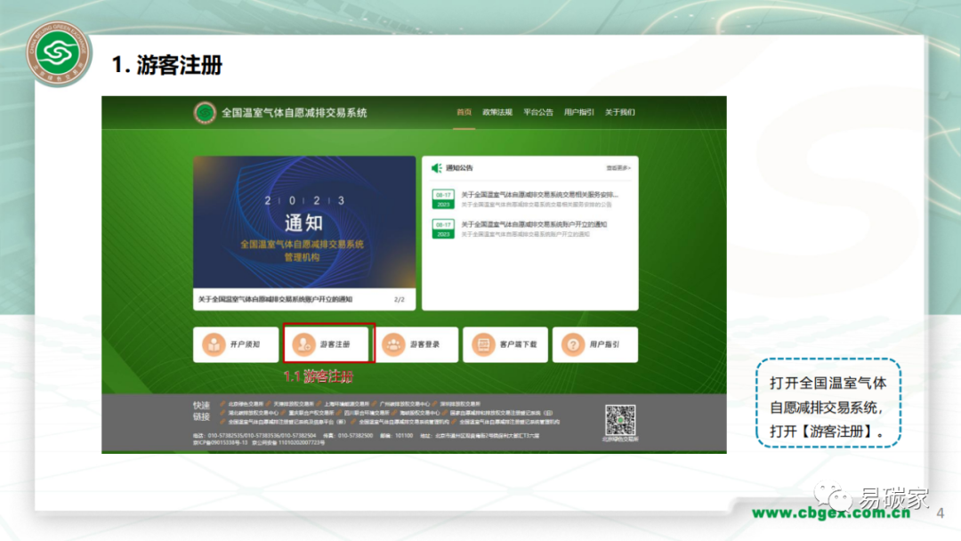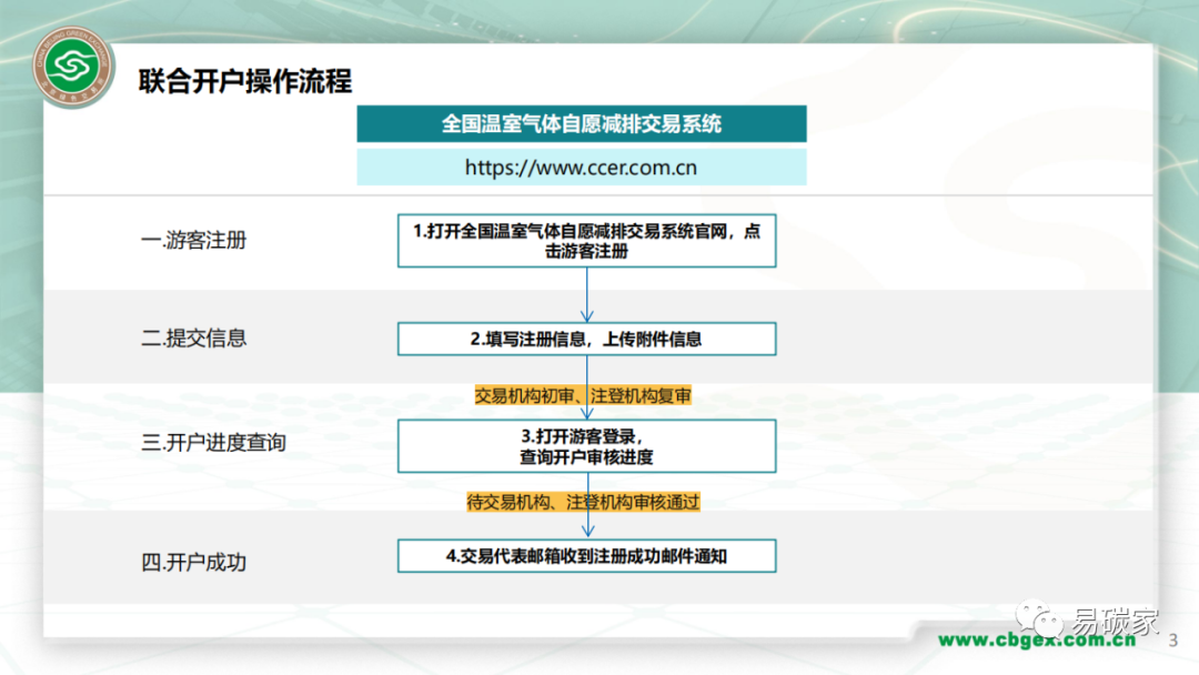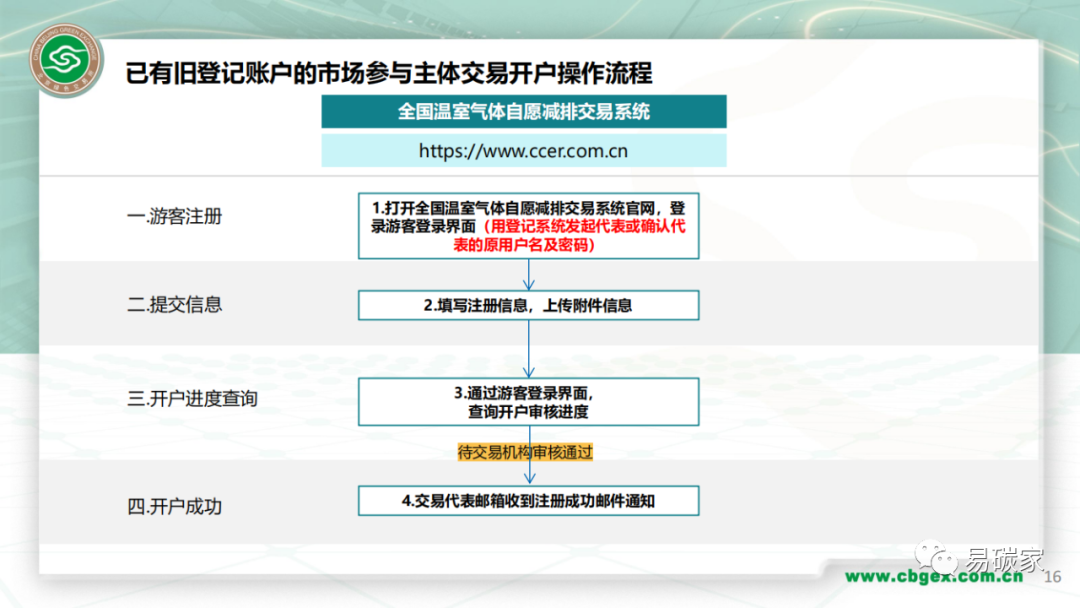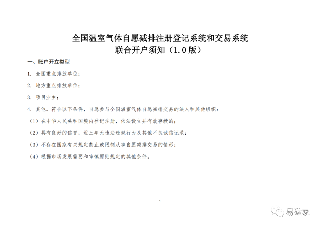 根据生态环境部《关于全国碳排放权交易市场2021、2022年度碳排放配额清缴相关工作的通知》(环办气候函〔2023〕237号)相关要求,现就全国温室气体自愿减排交易系统(以下简称“交易系统”)账户开立的相关事项通知如下:即日起可以向全国温室气体自愿减排交易系统管理机构(北京绿色交易所,以下简称“交易系统管理机构”)提交登记账户和交易账户开立申请材料,申请材料清单及要求见交易系统网站《全国温室气体自愿减排交易联合开户须知(1.0版)》。对2023年8月18日前已开立旧有自愿减排注登系统登记账户的市场参与主体,从2023年8月21日起,可使用相同的发起代表或确认代表账号及密码登录全国温室气体自愿减排注册登记系统(以下简称“新自愿减排注登系统”)。在交易系统使用旧有自愿减排注登系统发起代表或确认代表账号及密码,可登录游客登录界面,补充相关材料后提交交易系统开户申请。对2023年8月18日前(含)未开立旧有自愿减排注登系统登记账户的市场参与主体,如需要使用旧有CCER抵销2021、2022年度配额清缴的,需分别开立旧有自愿减排注登系统登记账户、九家交易机构中任意一家交易系统交易账户和新自愿减排注登系统登记账户。新自愿减排注登系统登记账户开立申请材料由交易系统管理机构初审通过后,提交至全国温室气体自愿减排注册登记系统管理机构(国家应对气候变化战略研究和国际合作中心,以下简称“注登系统管理机构”)复审,复审通过后,由注登系统管理机构完成登记账户开立。交易系统管理机构对交易账户开立申请材料审核通过后完成交易账户开立。[2]:http://registry.ccersc.org.cn/login.do[3]:https://ccer.cets.org.cn[4]:https://ucws.ccer.com.cn/login_visitor.htm
