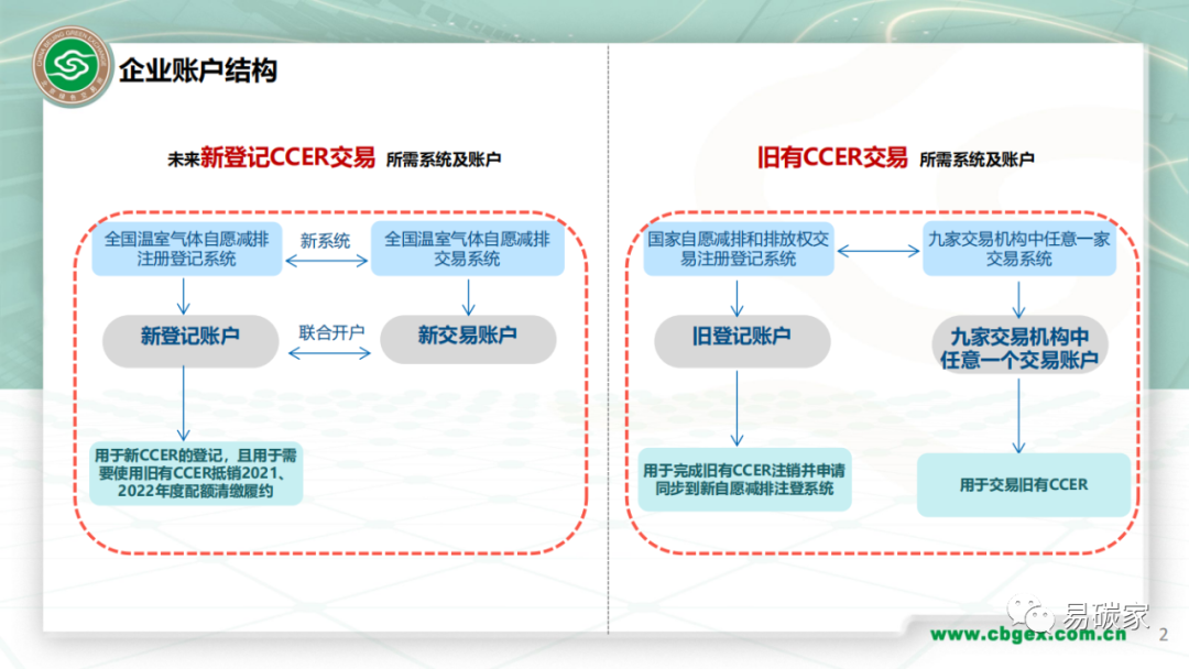 关于全国温室气体自愿减排交易系统交易相关服务安排的公告全国温室气体自愿减排交易系统(网址:www.ccer.com.cn)即日起开通开户功能,接受市场参与主体对登记账户和交易账户的开户申请,交易功能开通时间另行通知。2017年3月14日前已经获得备案的减排量(以下简称“旧有CCER”)仍在北京绿色交易所等九家交易机构继续交易。有交易旧有CCER需求的主体可继续通过九家交易机构开立旧有自愿减排注登系统(网址:http://registry.ccersc.org.cn/login.do)登记账户和九家交易机构中任意一家交易系统交易账户。相关开户要求详见各交易机构网站。天津排放权交易所:https://www.chinatcx.com.cn上海环境能源交易所:https://www.cneeex.com广州碳排放权交易中心:https://www.cnemission.com深圳排放权交易所:https://new.szets.com湖北碳排放权交易中心:https://www.hbets.cn重庆联合产权交易所:https://tpf.cqggzy.com四川联合环境交易所:https://ets.sceex.com.cn海峡股权交易中心:https://carbon.hxee.com.cn