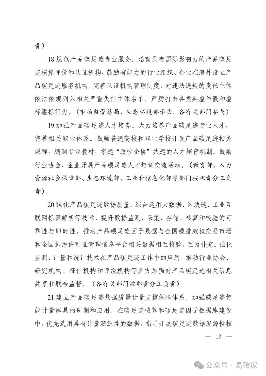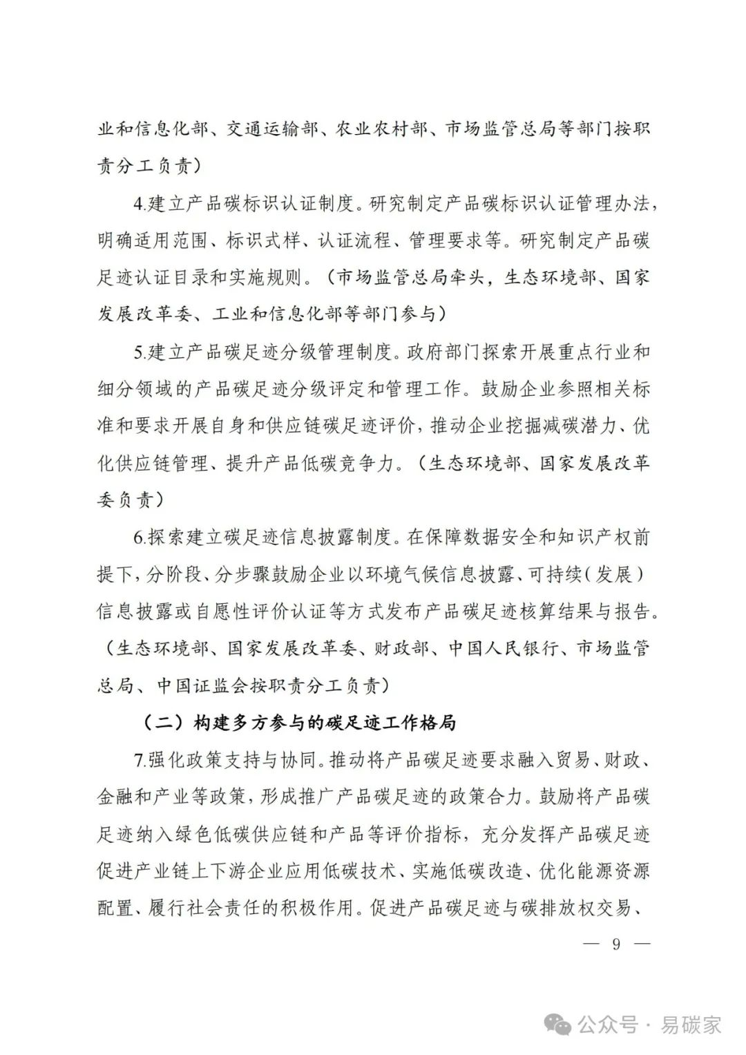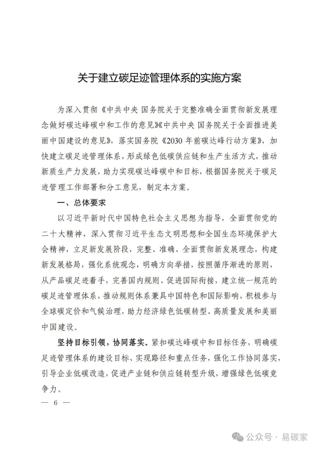 为深入贯彻落实《中共中央 国务院关于全面推进美丽中国建设的意见》《中共中央 国务院关于完整准确全面贯彻新发展理念做好碳达峰碳中和工作的意见》和《2030年前碳达峰行动方案》部署要求,加快建立碳足迹管理体系,形成绿色低碳供应链和生产生活方式,推动新质生产力发展,助力实现碳达峰碳中和目标,生态环境部会同国家发展改革委、工业和信息化部、财政部、人力资源社会保障部、住房城乡建设部、交通运输部、商务部、中国人民银行、国务院国资委、海关总署、市场监管总局、金融监管总局、中国证监会、国家数据局制定了《关于建立碳足迹管理体系的实施方案》。现印发给你们,请认真抓好落实。
