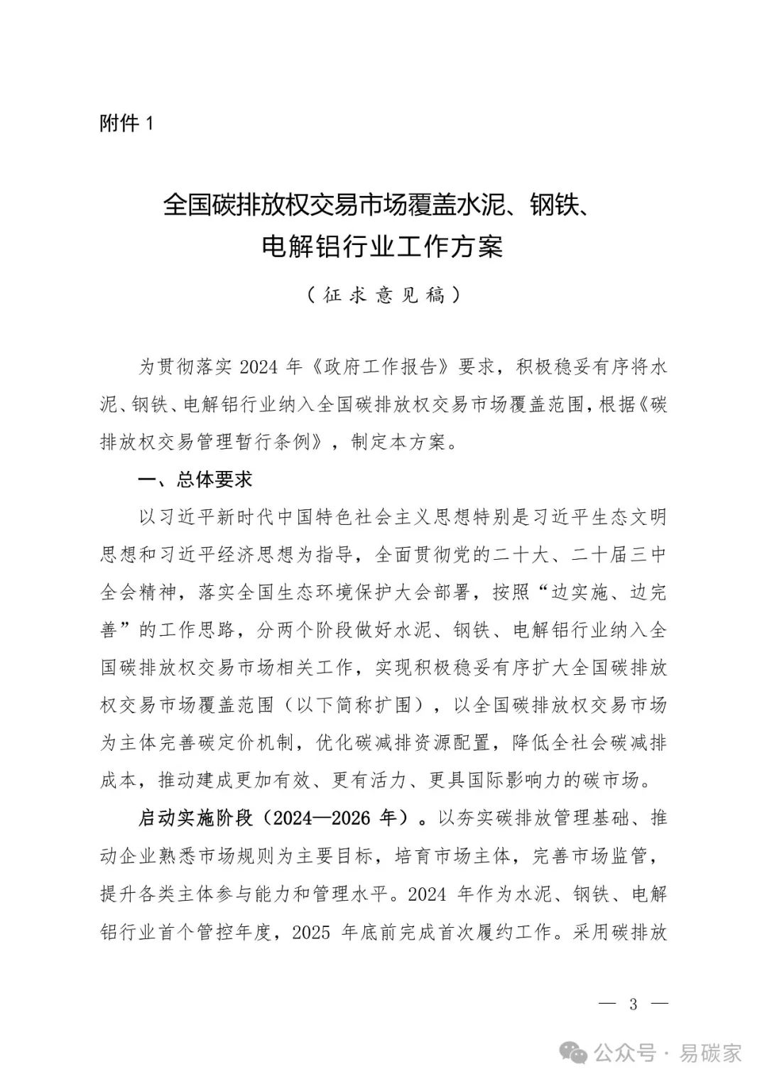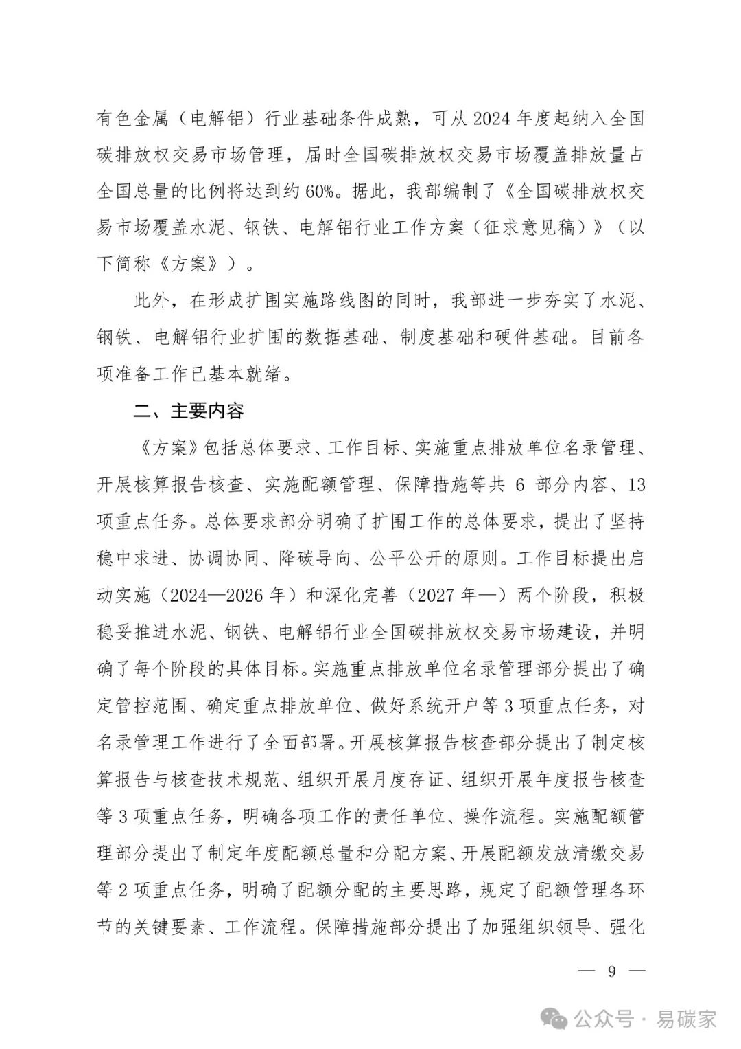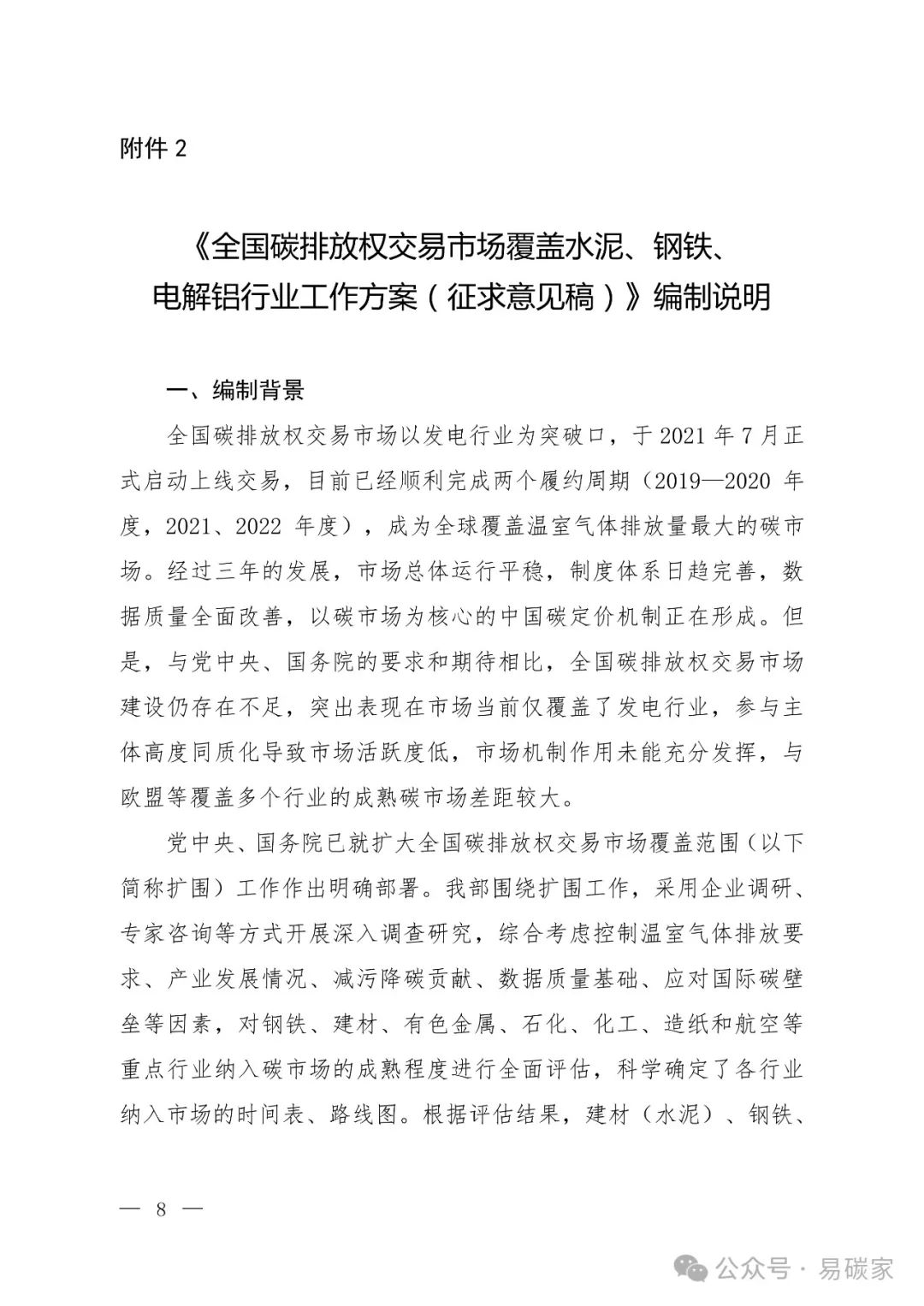 排放权交易市场覆盖水泥、钢铁、电解铝行业工作方案(征求意见稿)》,现公开征求意见(征求意见稿及其编制说明等材料可登录我部网站http://www.mee.gov.cn/ “意见征 各机关团体、企事业单位和个人均可提出意见和建议,有关意见请书面反馈我部(电子版材料请同时发至联系人邮箱)。征求意见截止时间为2024年9月19日。 电子邮箱:climate_china@mee.gov.cn 1.全国碳排放权交易市场覆盖水泥、钢铁、电解铝行业工作方案(征求意见稿) 2.《全国碳排放权交易市场覆盖水泥、钢铁、电解铝行业工作方案(征求意见稿)》编制说明